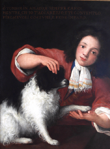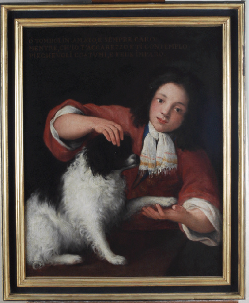 inscription, En haut : O TOMBOLIN AMATO,E SEMPRE CARO/ MENTRE, CH'IO T'ACCAREZZO, E TI CONTEMPLO/ PIEGHEVOLI COSTUMI, E TEUE IMPARO ; étiquette, Sur le châssis : M P R 6206 CHAMBERY Venise XVIII° PT d'enfant avec chien