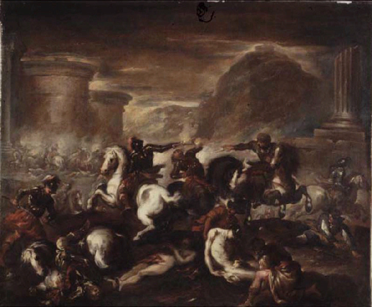 Source : BREJON DE LAVERGNEE, Arnault., VOLLE, Nathalie (1988). Musées de France - Répertoire des peintures italiennes du XVIIe siècle. Paris : RMN ; voir aussi : Une bataille avec un obélisque à gauche (M 1004) Pendant