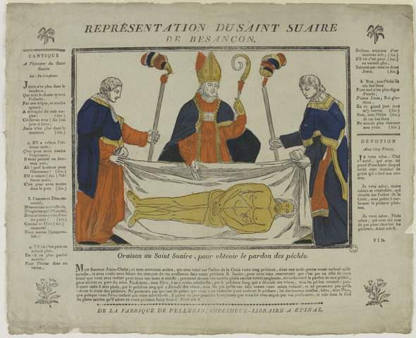 DE LA FABRIQUE DE PELLERIN, IMPRIMEUR-LIBRAIRE A EPINAL (b. m.) ; CANTIQUE / A l'honneur du Saint / Suaire. / Air : Du Confiteor. (...) Ne saurait plus charmer / mes yeux. (bis.) (g. d.) ; DEVOTION / Aux cinq Plaies. (...) Ainsi soit-il. / FIN. (d.) ; Oraison au Saint Suaire, pour obtenir le pardon des péchés. (...) et voir dans le Ciel / les plaies sacrées qu'il adore en votre précieux Saint Suaire. Ainsi soit-il. (b. m.)
