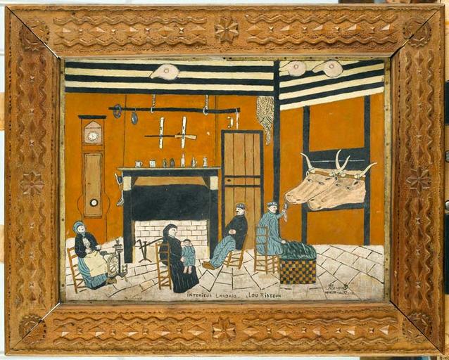 scène (intérieur, Landes d, homme, femme, enfant, filage, maïs, alimentation animale, bovin, cheminée, horloge, fusil, charcuterie, vannerie)