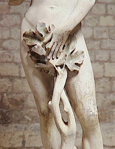 Adam, debout, derrière une tige de figuier dont les feuilles qu'il maintient de la main gauche cachent sa nudité. Le bras droit replié monte sur sa poitrine.; Le bras droit, les deux jambes et les orteils du pied gauche ont été refaits par M. Geoffroy. Il ne reste qu'un fragment de l'avant bras et de la jambe gauche.