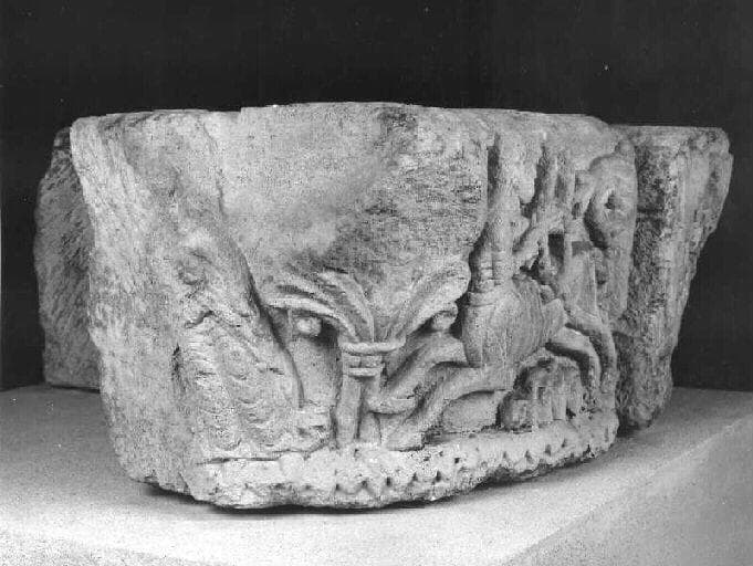 provient de l'église abbatiale Sainte-Geneviève à Paris, détruite en 1807 (Chapiteau du premier pilier droit de la nef de l'église, à partir du choeur, dos à l'entrée) ; Sculptures récupérées par Alexandre Lenoir, pour son musée des Monuments Français, lors de la destruction de l'église. En 1816 déposé à l'école des Beaux Arts. Entré au musée du Moyen Age en 1969 et 1983.