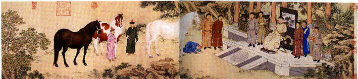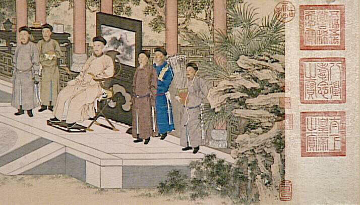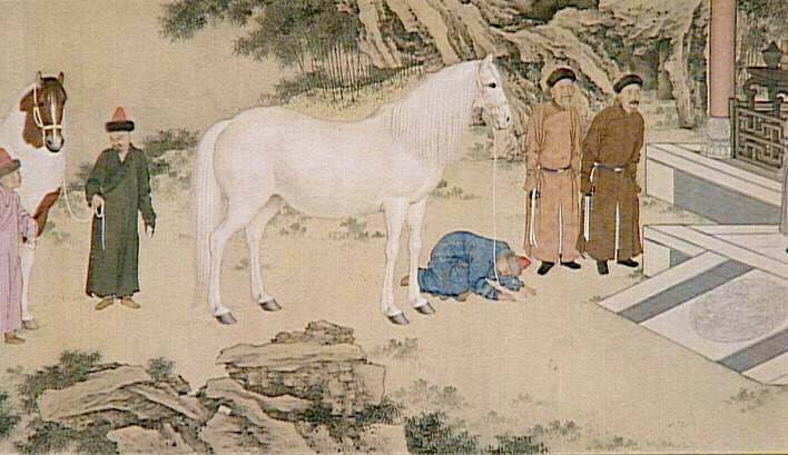 Les envoyés des Qazak présentent des chevaux comme tribut à l'empereur Qianlong. L'empereur est assis sur une terrasse, devant un paravent, entouré de dignitaires