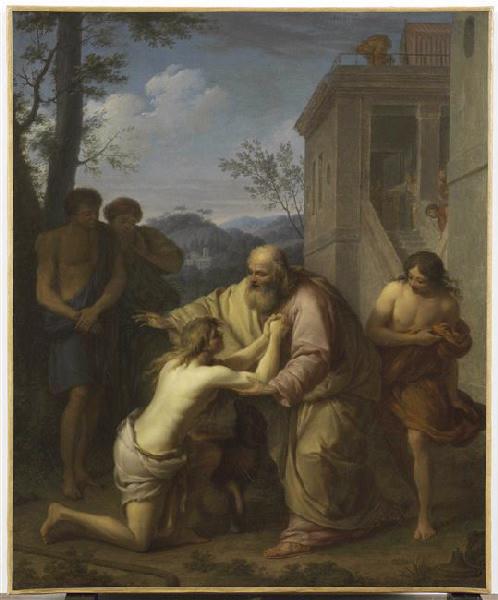 L'enfant prodigue est agenouillé devant son père. Trois jeunes hommes regardent la scène qui se déroule au pied d'une architecture avec un escalier; à l'arrière-plan un paysage.