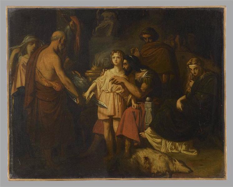 Un enfant tenant un poignard est retenu par un homme barbu assis. Devant eux la dépouille d'un mouton sacrifié. A gauche, un homme vu de dos présente un plat. Au fond une statue antique.