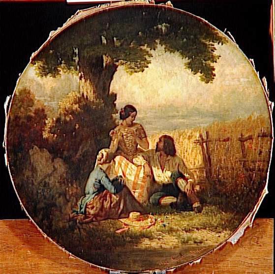 signature, datation, en bas au centre : S.D.b.c. : '1845. Faustin Besson'. ; étiquette annotée, étiquette imprimée, revers, de la main de M. Magnin : 'Faustin Besson. Un jour d'été. Salon de 1846' et : 'Exposition Louis-Philippe, juin-juillet 1926, Hôtel Charpentier' annotée par M. Magnin : 'n° 614 du cat.'.