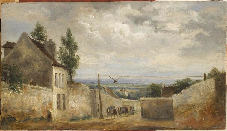 Vue d'un village traversé par une route sur laquelle se trouvent deux chevaux et une charrette. Au fond s'étend la plaine.