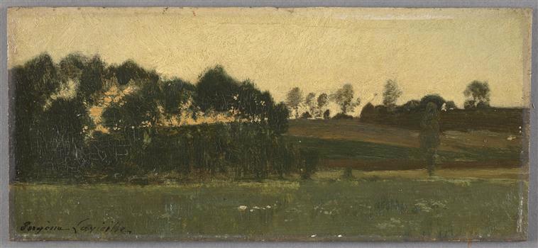 Paysage crépusculaire. Une forêt clairsemée occupe la partie gauche, tandis qu'à l'arrière-plan se profile une colline boisée de bosquets et d'arbres.