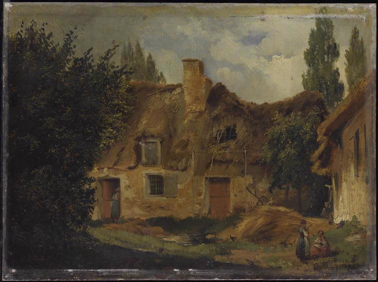 Vieille ferme recouverte d'un toit de chaume en partie détruit, entourée de peupliers et d'arbres. Sur la droite apparaît un autre bâtiment de ferme. Devant un tas de foin, quelques poules et canards près d'une petite mare et à droite au premier plan, deux fillettes dont l'une est assise.