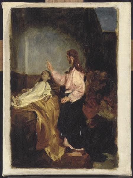 Il s'agit d'une esquisse pour le tableau de Dehodencq, La Résurrection de la fille de Jaïre exposé au Salon de 1876 (n° 590) et acheté pour l'église de la ville de Mâle (Orne). Plusieurs dessins préparatoires sont passés en vente à l'hôtel Drouot en 1979 (11 mai) et en 1980 (30 avril). Une autre esquisse peinte (collection particulière), de dimensions proches de celle-ci, fut publiée dans la monographie de G. Séailles (1910, n° 208, repr. p. 171).