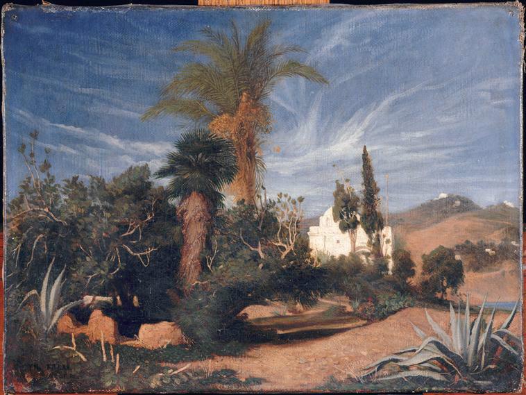 signature, localisation, en bas à gauche (peu lisible) : Th. FRERE/ ALGER ; étiquette annotée, revers, de la main de M. Magnin : 'Théodore Frère. Environs d'Alger (mosquée de Sidi Abder Akmann ?)'
