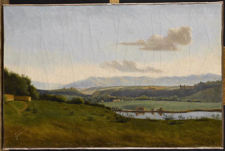 signature, en bas à gauche : Grobon ; étiquette annotée, Revers : De la main de M. Magnin : 'Grobon (Jean-Michel) Lyon 1770 - 1853. Vue prise dans la vallée de la Saône (?)'.