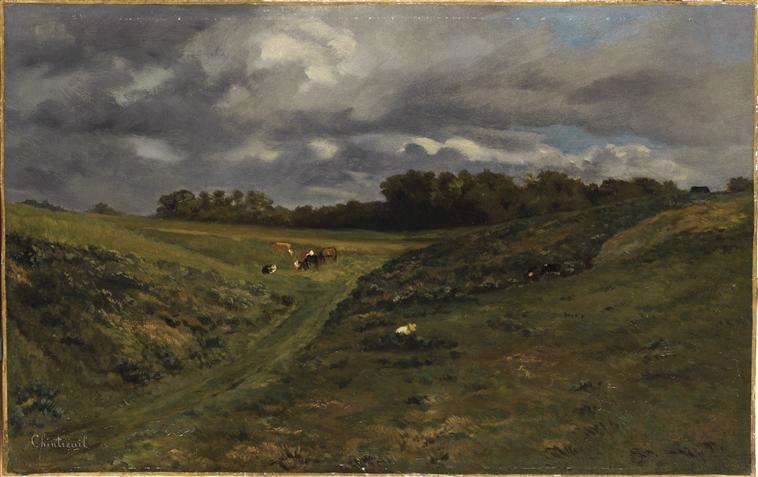 paysage (champ, chemin, paysan, vache, orage)