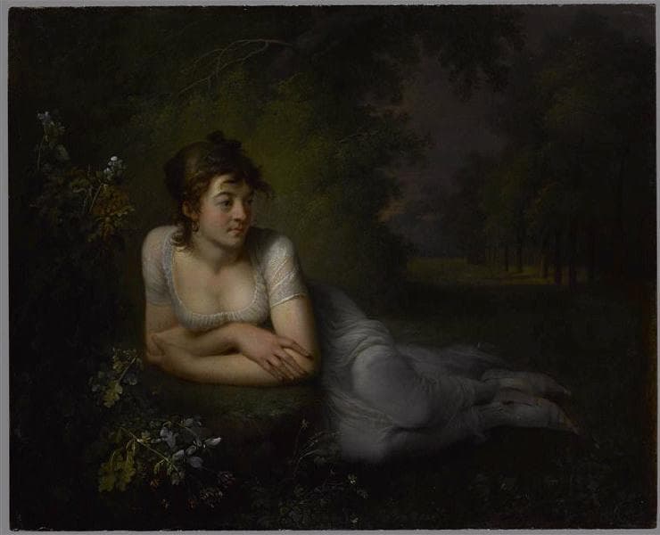 Christine Boyer, première femme de Lucien Bonaparte, qu'elle avait épousé en 1794, est représentée dans le parc du château de Plessis-Chamant, près de Senlis. B. Edelein-Badie situe l'oeuvre entre 1799 et 1800, dates qui correspondent à l'acquisition du domaine et au décès de la jeune femme. Elle pense que Gros s'inspira de cette peinture pour son célèbre Portrait de Christine Boyer (Paris, musée du Louvre, R.F. 838). Le caractère presque irréel de l'oeuvre du musée Magnin, qui campe le modèle dans un jardin à la lumière ténue, la représentation de plantes fanées, pourraient être un rappel de la destinée tragique de la jeune femme, comme le soulignent J. Thuillier et S. Laveissière (communication orale, septembre 1999). Ne s'agit-il donc pas plutôt d'un portrait posthume ? La qualité picturale du tableau, le goût de traiter un portrait en plein air ne sont pas caractéristiques de l'art de Schall et invitent à considérer avec circonspection l'attribution. Il n'y a par ailleurs pas de trace de commande d'un tel tableau par Lucien Bonaparte. Le seul argument en faveur de l'attribution réside dans les affinités avec le tableau du Salon de 1806 : Pensée sur la brièveté de la vie (Paris, musée du Louvre, inv. 7850), également sur bois, qui témoigne d'un aspect grave et méditatif, exceptionnel chez l'artiste.