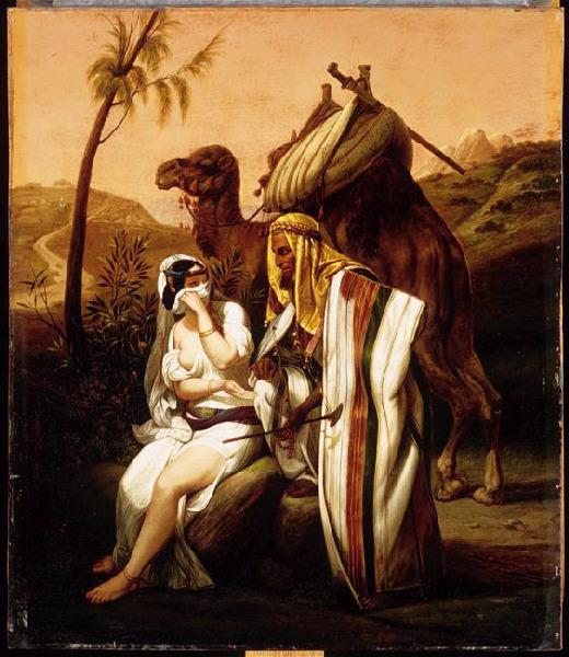scène biblique (Juda, Thamar, vêtement : à l'orientale, bijou, don, dromadaire) ; fond de paysage (Afrique)