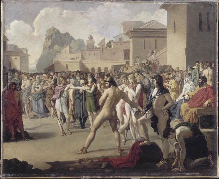 scène mythologique (Antiquité, Ulysse, place, foule, athlétisme, homme, nu, disque)