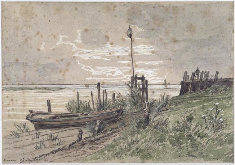 annotation, en bas à gauche, à la plume et encre noire : Anvers 23 juillet 60 ; marque de la vente de l'atelier, en bas à gauche en rouge (Lugt 60) ; annotation, au revers, à la mine de plomb. : 17 - série 4 Escaut ; étiquette imprimée, cadre, revers : (décollée du revers - en partie déchirée) : Vente AUG. ANASTASI 1873, annotée à la plume et encre brune : Escau [...] ; notice de catalogue, cadre, revers : (décollée du revers) : ANASTASI (Auguste)/ 45 - Bords de l'Escaut./ Aquarelle portant à gauche, en bas, l'indication : Anvers, 23 Juillet 60.