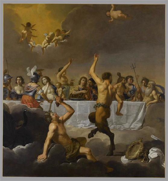 scène mythologique (Olympe, banquet, table, nappe, coupe, plat, orfèvrerie, Apollon, rayons lumineux, lyre, Minerve, casque, lance, Diane, croissant de lune, Vénus, nudité, Cupidon, Mars, casque, plume, armure, Hercule, massue, Hébé, Flore, Neptune, trident, barbe, vieillard, Bacchus, assis, raisin, satyre, danse, Eris, discorde, pomme d'or, putti, nuage, paon)