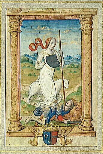 Enluminure : Humilité contre orgueil dans un cadre d'architecture et devant un paysage, l'Humilité vêtue de blanc et chevauchant un mouton perce de de son épieu l'Orgueil couronné et chevauchant un lion.