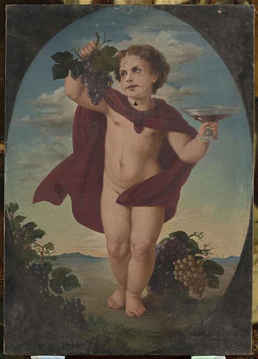 enfant drapé dans une étole rouge, tenant dans la main droite une grappe de raisin, et dans la main gauche une coupe de vin; à ses pieds : grappes de raisin rouge et blanc.