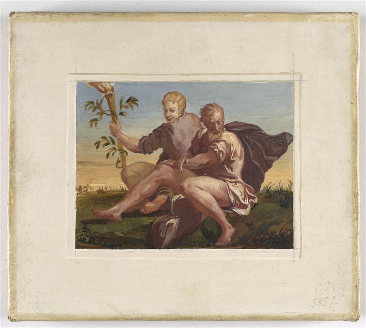 Esquisse (ricordo) d'après les fresques de la Salle de Bal restaurées pr l'artiste ; Dans un même cadre avec : Pan, Pomone ?, Esculape ? et un autre homme, un serpent et un bâton à côté d'eux, L'Abondance