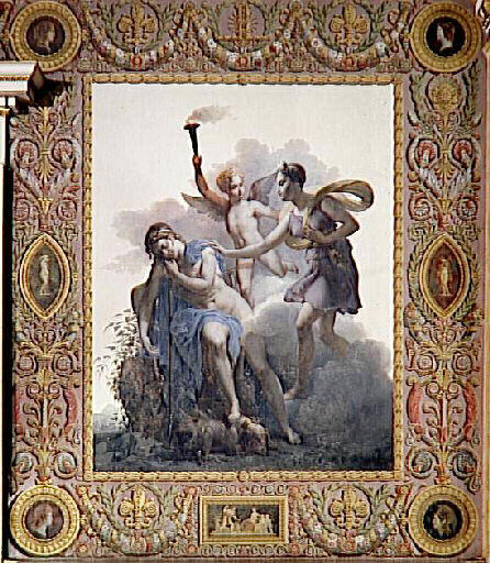 commande de Louis XVIII pour la seconde Galerie de Diane à Fontainebleau ; la voûte est peinte de l'histoire de Diane par Mery Joseph Blondel et Alexandre Abel de Pujol ; les deux artistes exécutèrent quatre travées en alternance entre 1822 et 1825