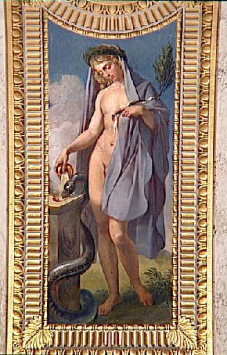 commande de Louis XVIII pour la seconde Galerie de Diane à Fontainebleau ; la voûte est peinte de l'histoire de Diane par Mery Joseph Blondel et Alexandre Abel de Pujol ; les deux artistes exécutèrent quatre travées en alternance entre 1822 et 1825