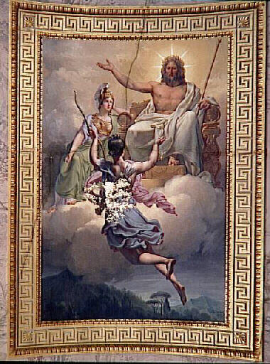 commande de Louis XVIII pour la seconde Galerie de Diane à Fontainebleau ; la voûte est peinte de l'histoire de Diane par Mery Joseph Blondel et Alexandre Abel de Pujol ; les deux artistes exécutèrent quatre travées en alternance entre 1822 et 1825
