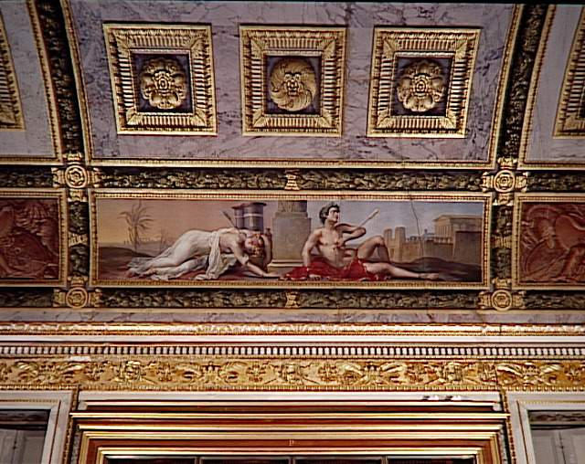 commande de Louis XVIII pour la seconde Galerie de Diane à Fontainebleau ; la voûte est peinte de l'histoire de Diane par Mery Joseph Blondel et Alexandre Abel de Pujol ; les deux artistes exécutèrent quatre travées en alternance entre 1822 et 1825