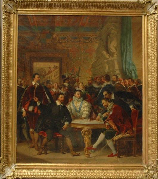 scène ; portrait collectif (Henri IV, Henri III, Guise Henri de, Lorraine Henri de, Henri II, homme, assis, conversation, attroupement)