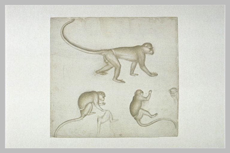 Trois singes dans différentes attitudes, esquisse et tête d'un autre singe