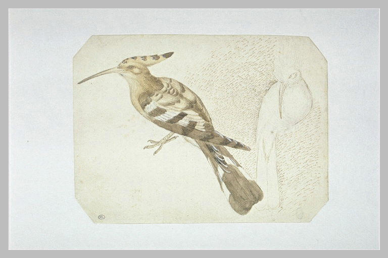 Plume et encre brune, tracé préparatoire à la pointe de plomb (pour la huppe de face), complété au lavis brun et à l'aquarelle, rehaussé de blanc (pour la huppe de profil). Papier filigrané. Angles abattus