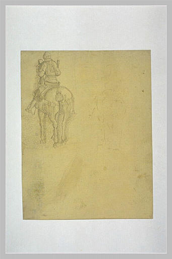 Condottiere en armure, sur un cheval, vu de dos ; esquisses du même motif