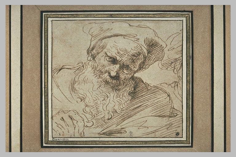 Un buste de vieillard, vu de face, la tête inclinée à droite