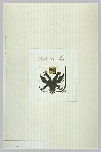 Album Ecole française XVIIeme siècle, folio 34, rapporté au recto ; Album semi-factice. Relié en cuir marron, dos portant le titre en lettres d'or :Recueil d'armoiries, avec sur le plat supérieur une étiquette portant l'inscription :armoiries, Ecole française 17è siècle. Sur le folio 3, un tampon de la bibliothèque du Louvre. Etudes de blasons. Sur le contreplat de derrière, trois cachets de cire. H. 0,460 ; L. 0,296. ; Inscription, à la plume et encre brune, au-dessus :Ville de Loo