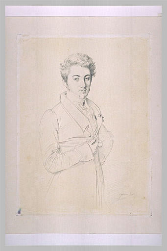 Marcellus (1795-1865), ici représenté dans tout l'éclat de sa jeune maturité, vers 1825, après le retour d'Ingres à Paris, porte un nom célèbre entre tous au Louvre : c'est en effet aux efforts de ce jeune diplomate que l'on doit l'acquisition par la France de la Vénus de Milo, lors d'une mission au Levant en 1820. Il avait été secrétaire d'ambassade à Constantinople, puis avait assisté Chateaubriand lorsque celui-ci avait représenté la France à Londres. Après un poste de ministre français à Lucques, il fut nommé sous-secrétaire d'État aux Affaires Étrangères en 1829, mais la Révolution de Juillet mit fin à sa carrière diplomatique ; il se consacra dès lors à la littérature. Ingres traça à la même époque le portrait (cf. Inv. RF31181) de son épouse, Thérèse-Joséphine-Céline (1809-1886), fille cadette du peintre de paysages néoclassiques Auguste de Forbin (1777-1841) qu'Ingres avait connu dans l'atelier de David et dont il fit également un portrait dessiné (Naef, 1977-1980, n° 87). Forbin devint sous la Restauration directeur des musées, poste où il put assurer à Ingres certaines commandes. Les portraits du couple Marcellus, classiquement tournés l'un vers l'autre, comptent parmi les mieux conservés de la belle série du Louvre. (L.-A. Prat, Ingres, Paris, Musée du Louvre, 5 Continents éditions, 2004, (Cabinet des dessins ; 4), n° 22, p. 82). Naef, Die Bildniszeichnungen von J.-A. D. Ingres, Berne, 1977-1980, t. II, chap. 129, et t. V, n° 304, repr.