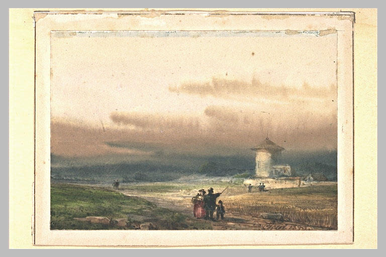 POP | Plateforme ouverte du patrimoinePaysage de plaine avec un couple et un enfant, vu de dos