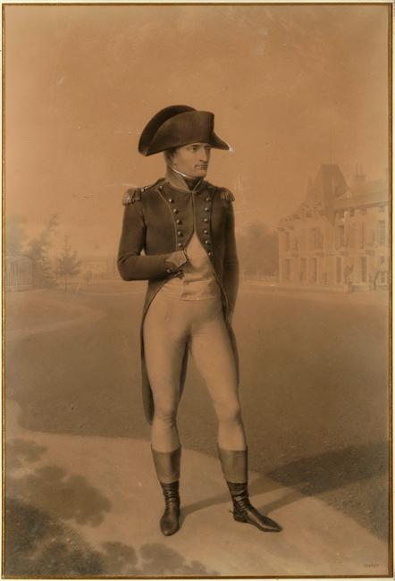 Bonaparte, en habit de général, la main droite passée dans le gilet, se promène dans une allée du parc. A droite, se profile le pavillon d'angle du château