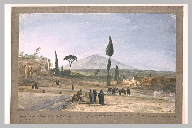 Ce dessin fait partie d'une série de 46 gouaches pour le Voyage pittoresque des isles de Sicile, de Malte et de Lipari, où l'on traite des Antiquités qui s'y trouvent encore ; des principaux Phénomènes que la Nature y offre ; du Costume des Habitans, & de Quelques Usages par Jean Houel, Peintre du Roi, à Paris. Gravé dans le volume III, Planche CLI.