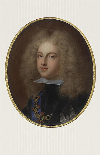 Miniature sur porcelaine. Cadre inscrit au verso :Philippe V/ Roi d'Espagne/ petit Fils de Louis XIV/ Peint/ par Mme Victoire Jaquotot/ d'après Rigaud/ en 1835