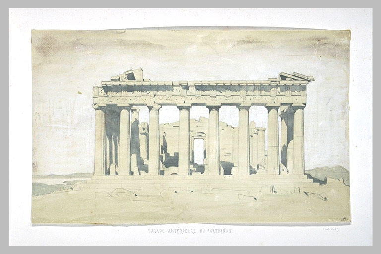 Mine de plomb et aquarelle, avec rehauts de gouache blanche, sur papier beige. Annotations au-dessous du dessin, à la mine de plomb :FACADE ANTERIEURE DU PARTHENON, et à droite(côté est)