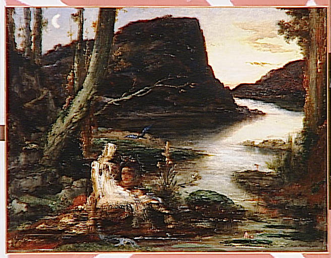 paysage (Narcisse myth : homme, dans les eaux, solitude, cours d'eau, montagne, oiseau, fleur, soir : lune)