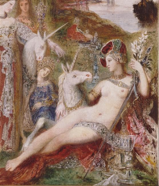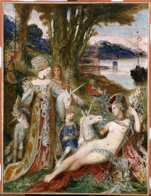 thème inspiré de la tapisserie de Cluny : La dame à la Licorne et du paysage de l'Allégorie de la cour d'Isabelle d'Este de Lorenzo Costa, que Gustave Moreau avait étudié au Louvre. Les motifs médiévaux sont tirés du Magasin pittoresque et dans les Monuments français de Nicolas Xavier Willemin