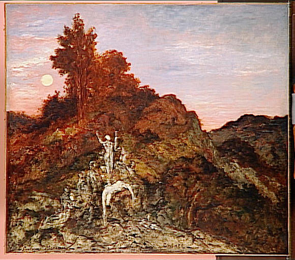 paysage (montagne, forêt, Orphée : mort, attroupement)