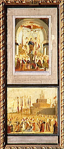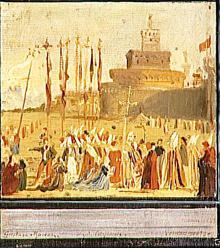 scène (Sainte Ursule de Cologne, palme, bannière de procession, foule)