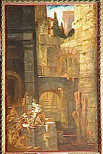 Gustave Moreau se souvient de Piranèse et de ses prisons dans le décor architectural de la scène. Gustave Moreau possédait un livre d'estampes de Piranèse