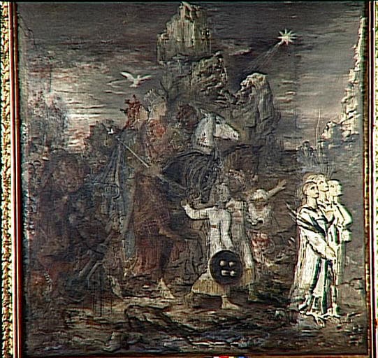 ébauche commencée en 1860 et reprise après 1882. Gustave Moreau rehausse un des rois par des éléments médiévaux peints au trait noir (motifs copiés d'après Willemin)