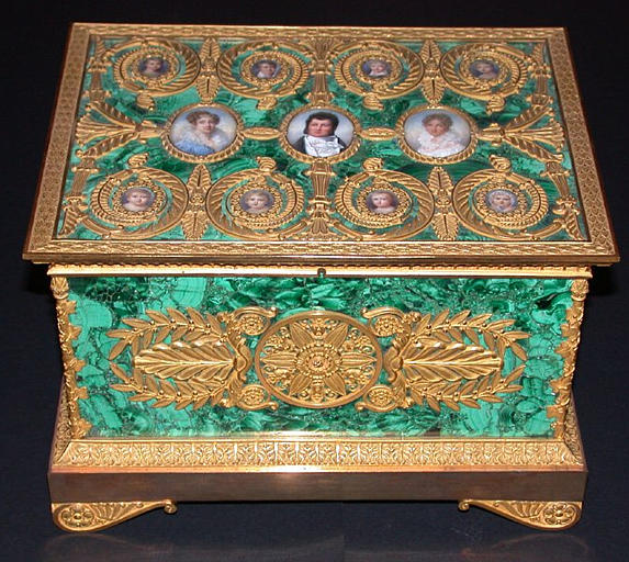 Boîte à musique en malachite et bronze doré dont le couvercle est orné de 11 médaillons représentant : le roi Louis-Philippe (1773-1851), la reine Marie-Amélie (1782-1866), leurs enfants et leur soeur : le duc de Chartres (1810-1842), Madame Adélaïde (1777-1847), la princesse Marie d'Orléans (1813-1839), le duc de Nemours, la princesse Louise d'Orléans (1812-1850), le prince de Joinville, la princesse Clémentine d'Orléans (1819-1890), le duc d'Aumale (1822-1897) et le duc de Montpensier