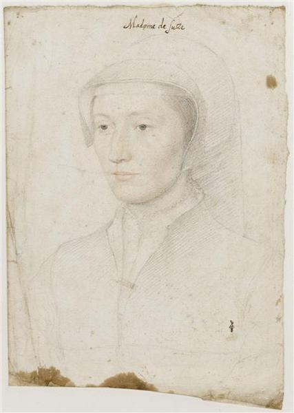 inscription donnant l'identité du modèle, marque concernant les collections : Madame de Suze (h. ) ; vers 1540 Madeleine de Villiers de l'Isle-Adam, veuve de Philippe de Suze, seigneur de Laversine et de Coye (sur le carton de montage)