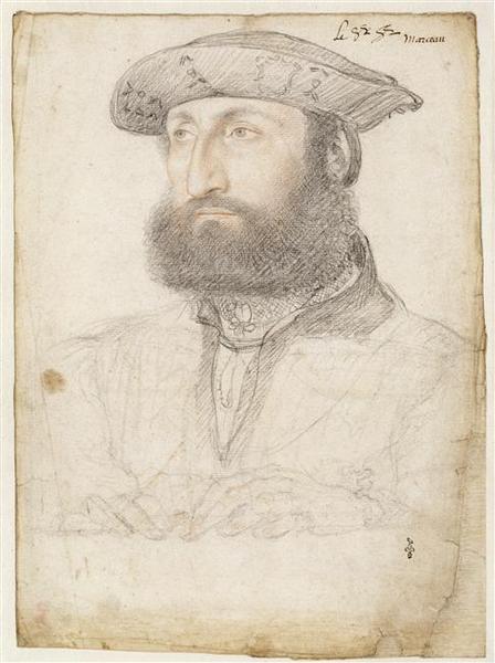 C'est le seul portrait d'homme réalisé par Jean Clouet où les mains sont visibles. Habituellement l'artiste rajoutait les mains et les vêtement directement sur la peinture. Le portrait peint de ce dessin est conservé à Bergame, Academia carrara, (inv.477). Le dessin inv. MN 166, également conservé au musée Condé de Chantilly, est une copie de celui-ci.